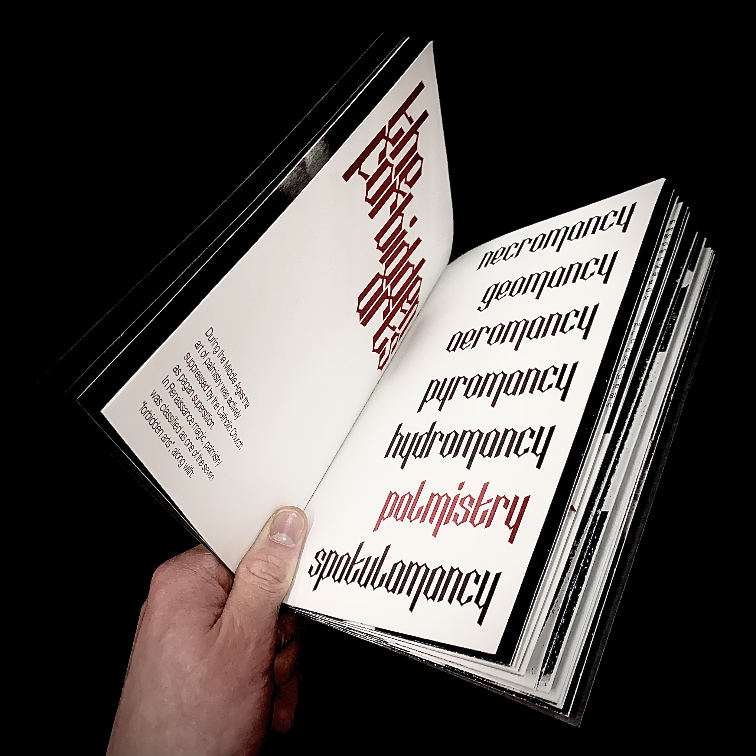 The title of the publication got its name from an old tale in the Middle Ages. Its to be believe people once thought palmistry was a form of witch craft, hence the name “The Forbidden Arts”. The book uses a grungy and saturated colour palette and is paired with custom lettering inspired by the old English typographic style. These design choices paired with a faded and distressed look was chosen to create the feeling for the viewer, that what they are reading is ancient.